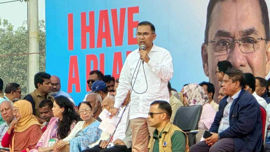 নীলফামারী পৌরসভা মাঠে আয়োজিত জনসভায় বিএনপির চেয়ারম্যান তারেক রহমান। ছবি: ঢাকা মেইল