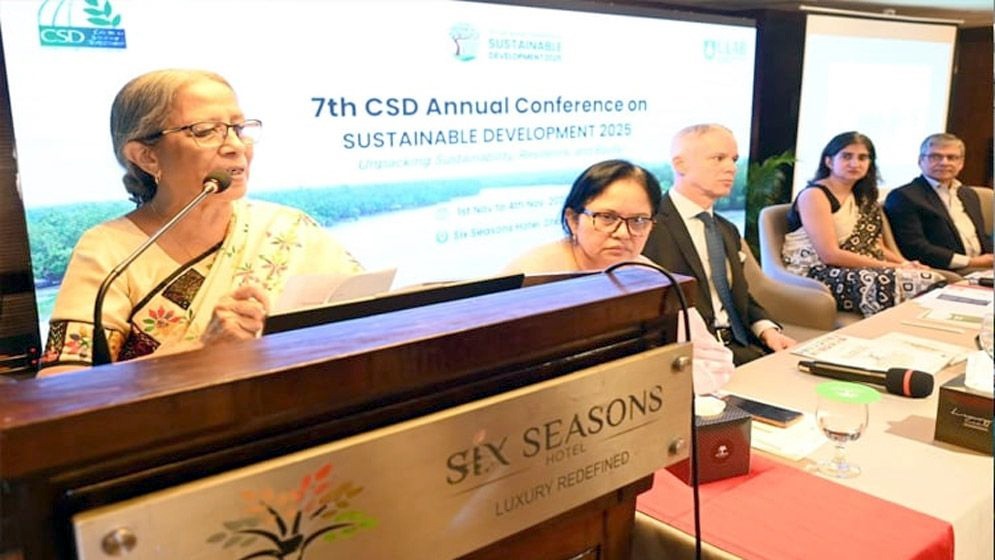 শনিবার (০১ নভেম্বর) সকালে সিক্স সিজনস হোটেলে অনুষ্ঠিত ৭ম সেন্টার ফর সাসটেইনেবল ডেভেলপমেন্ট সম্মেলন ২০২৫-এর উদ্বোধনী অনুষ্ঠানে প্রধান অতিথির বক্তৃতায় তিনি একথা বলেন।