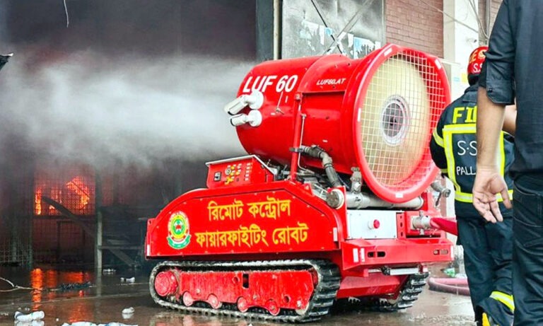 শনিবার (১৮ অক্টোবর) সন্ধ্যায় ফায়ার সার্ভিস সদর দফতরের মিডিয়া সেলের কর্মকর্তা তালহা বিন জসিম জানান, আগুন নিয়ন্ত্রণে দ্রুত অগ্রগতি আনতে রোবটটি ব্যবহার করা হয়েছে। এটি ফায়ার সার্ভিস অ্যান্ড সিভিল ডিফেন্সের আধুনিক অগ্নিনির্বাপণ যন্ত্র, যা ঝুঁকিপূর্ণ স্থানে কার্যকরভাবে কাজ করতে সক্ষম।