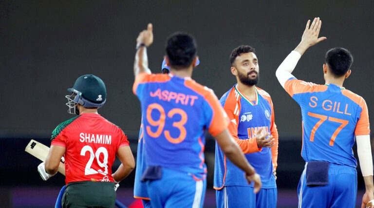 দ্বিতীয় ওভারে তানজিদ তামিম দ্রুত ফিরলেও সাইফ হাসান ও পারভেজ হোসেন ইমনের জুটিতে পাওয়ার প্লেতে ৪৪ রান তোলে বাংলাদেশ। কিন্তু এরপর নিয়মিত বিরতিতে উইকেট হারিয়ে ভেঙে পড়ে ব্যাটিং লাইনআপ। ৪১ রানের ব্যবধানে ইমন, তাওহীদ হৃদয়, শামিম হোসেন ও অধিনায়ক জাকের আলী ফেরায় দল পড়ে বড় চাপে।